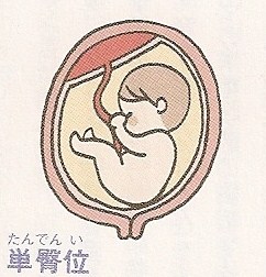 立膝をついたような体勢で、ひざは子宮口の方を向いている状態です。帝王切開が安全でしょう。 |